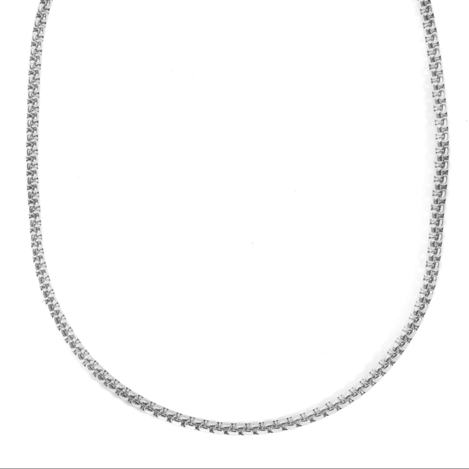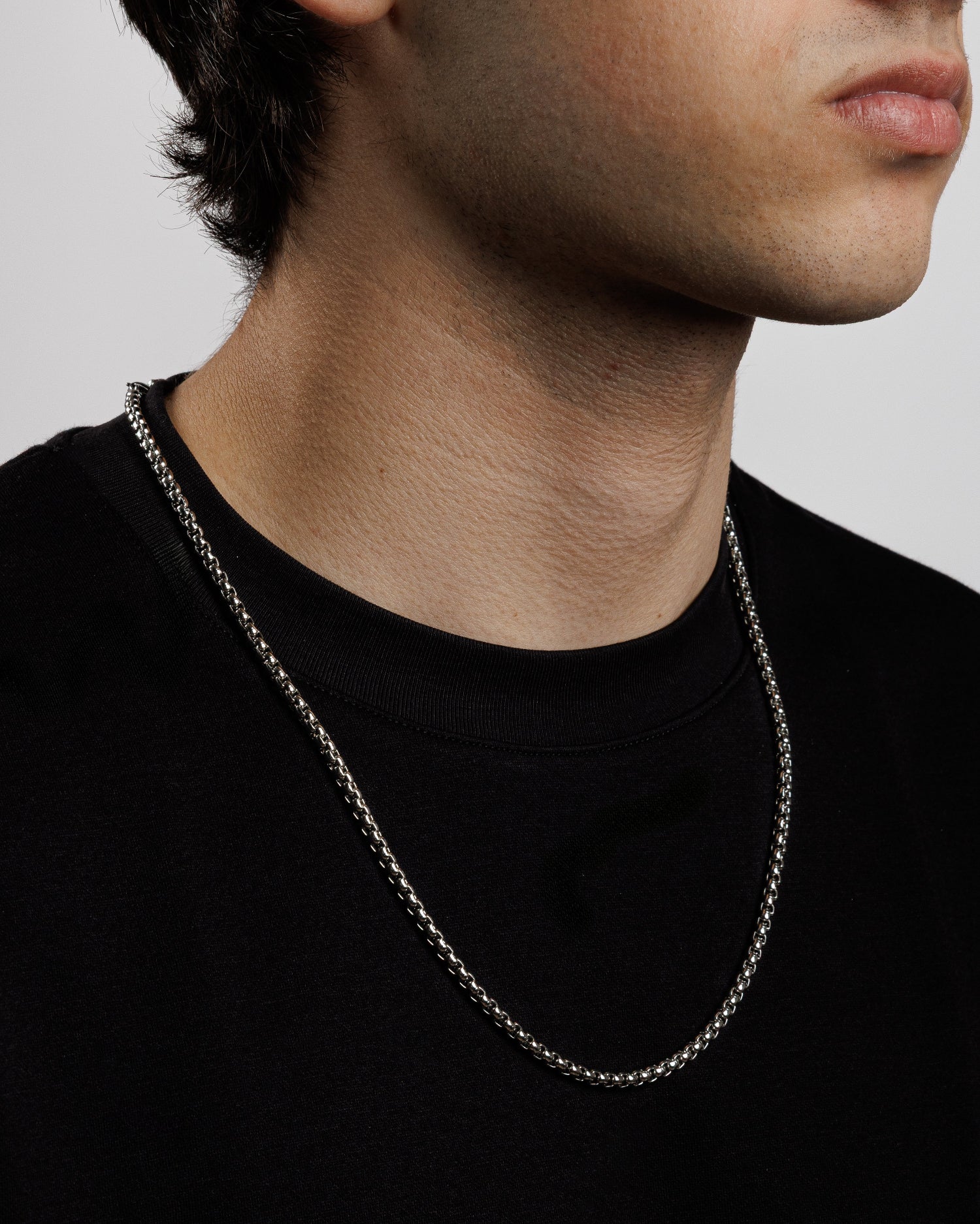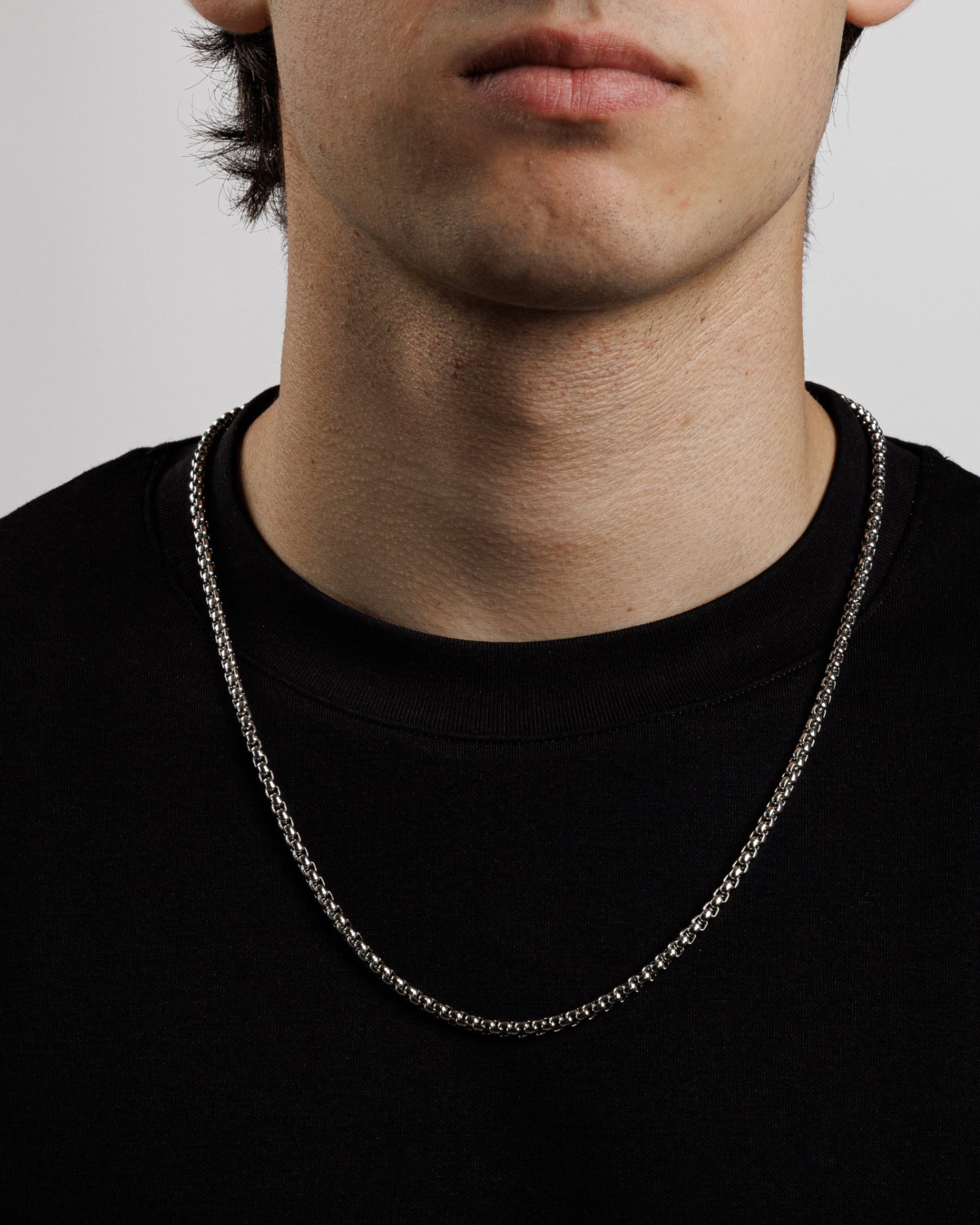 Quadratische Glieder, klar gereiht und spürbar präsent: Die 5-mm-Box-Kette zeichnet eine massive, geometrische Linie am Hals und bringt Ordnung in den Look – clean, urban, unapologetic. Solo trägt sie den Auftritt mühelos; im Layering wird sie zum stabilen Backbone.