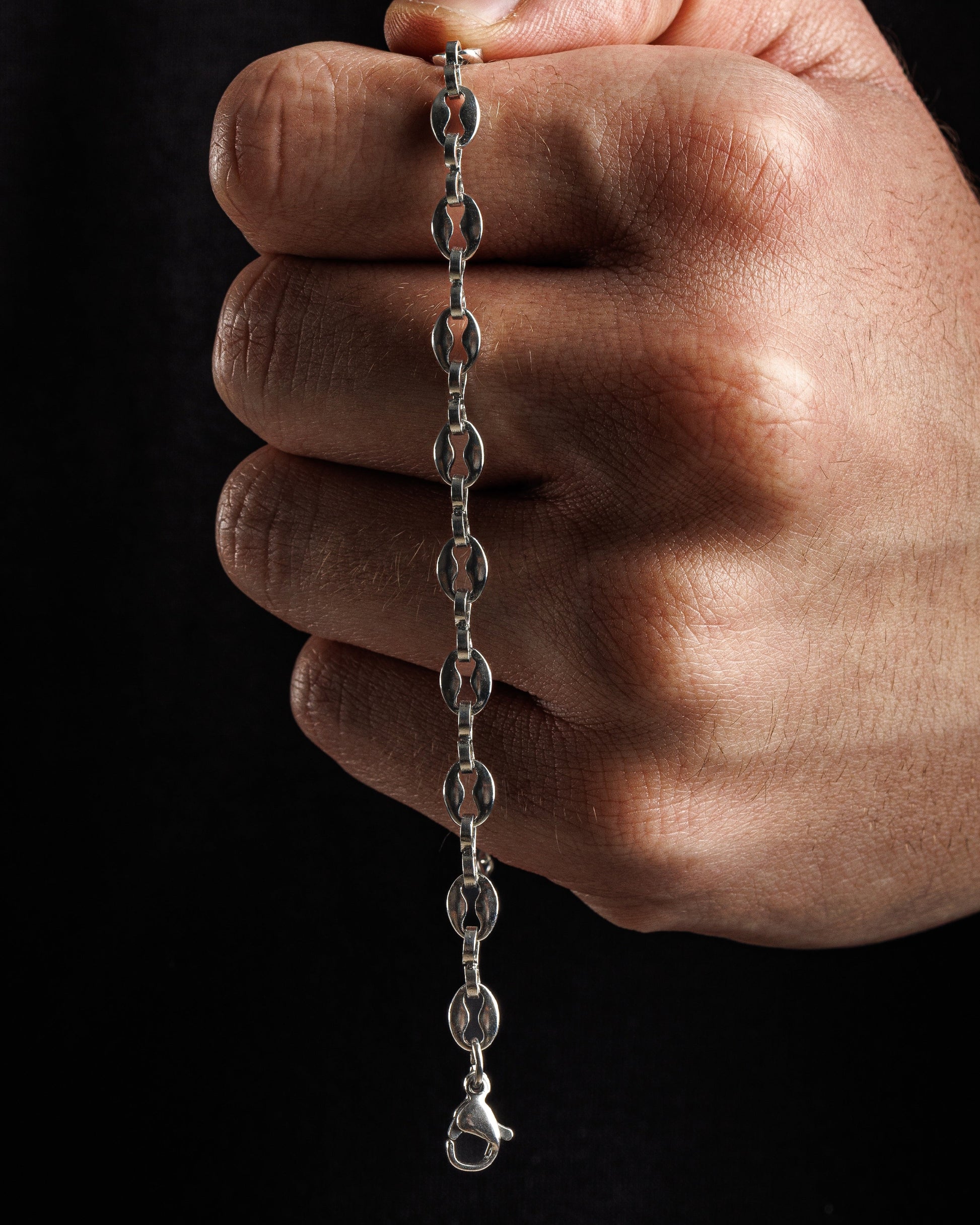 Das Coffee-Bean-Armband setzt auf dicht gereihte, kapselartige Glieder, die sich geschmeidig um das Handgelenk legen und einen gleichmäßigen, fast pulsenden Rhythmus erzeugen. Der Look zitiert dezent Vintage-Codes, bleibt dabei klar modern und bringt spürbare Struktur in jedes Outfit.