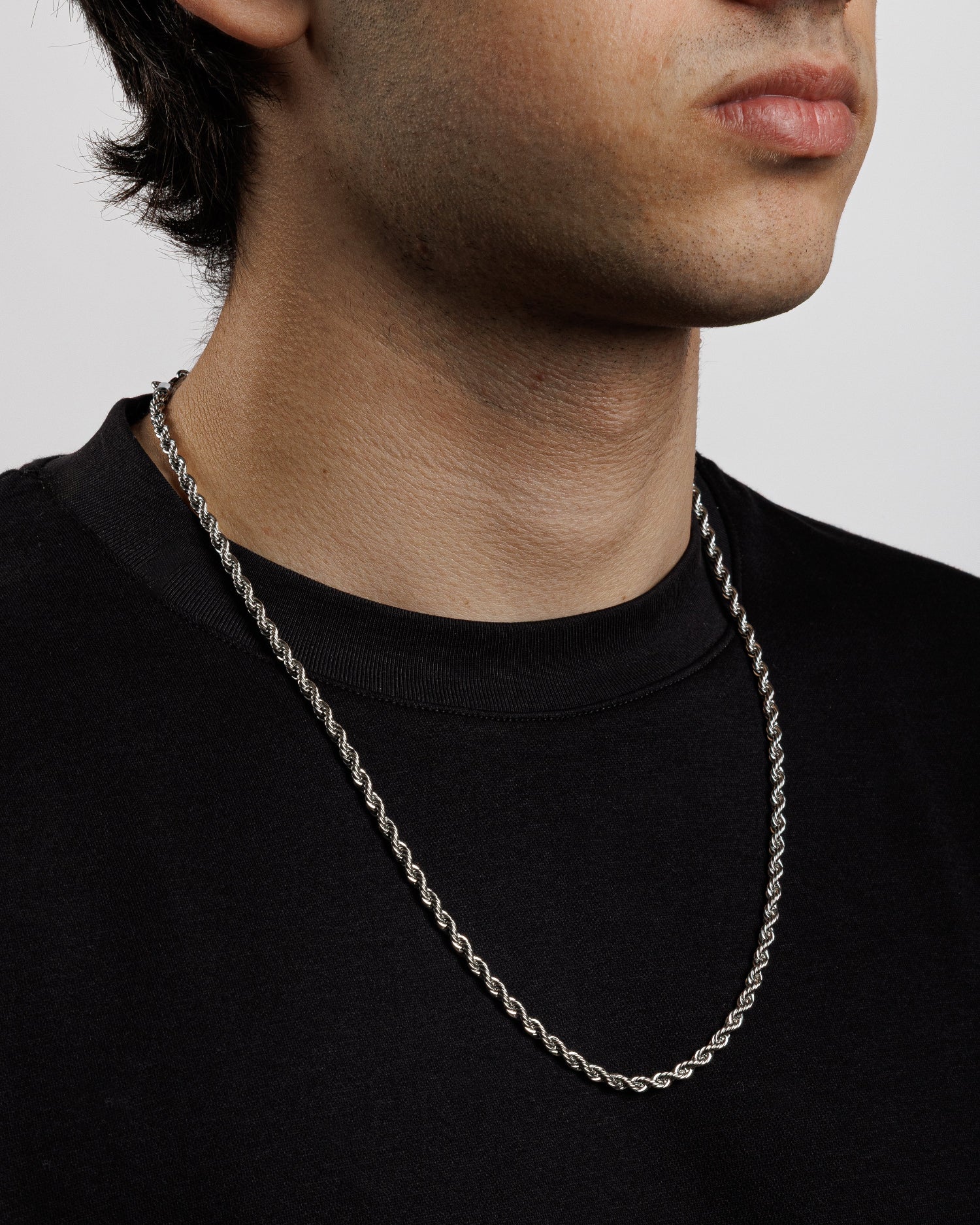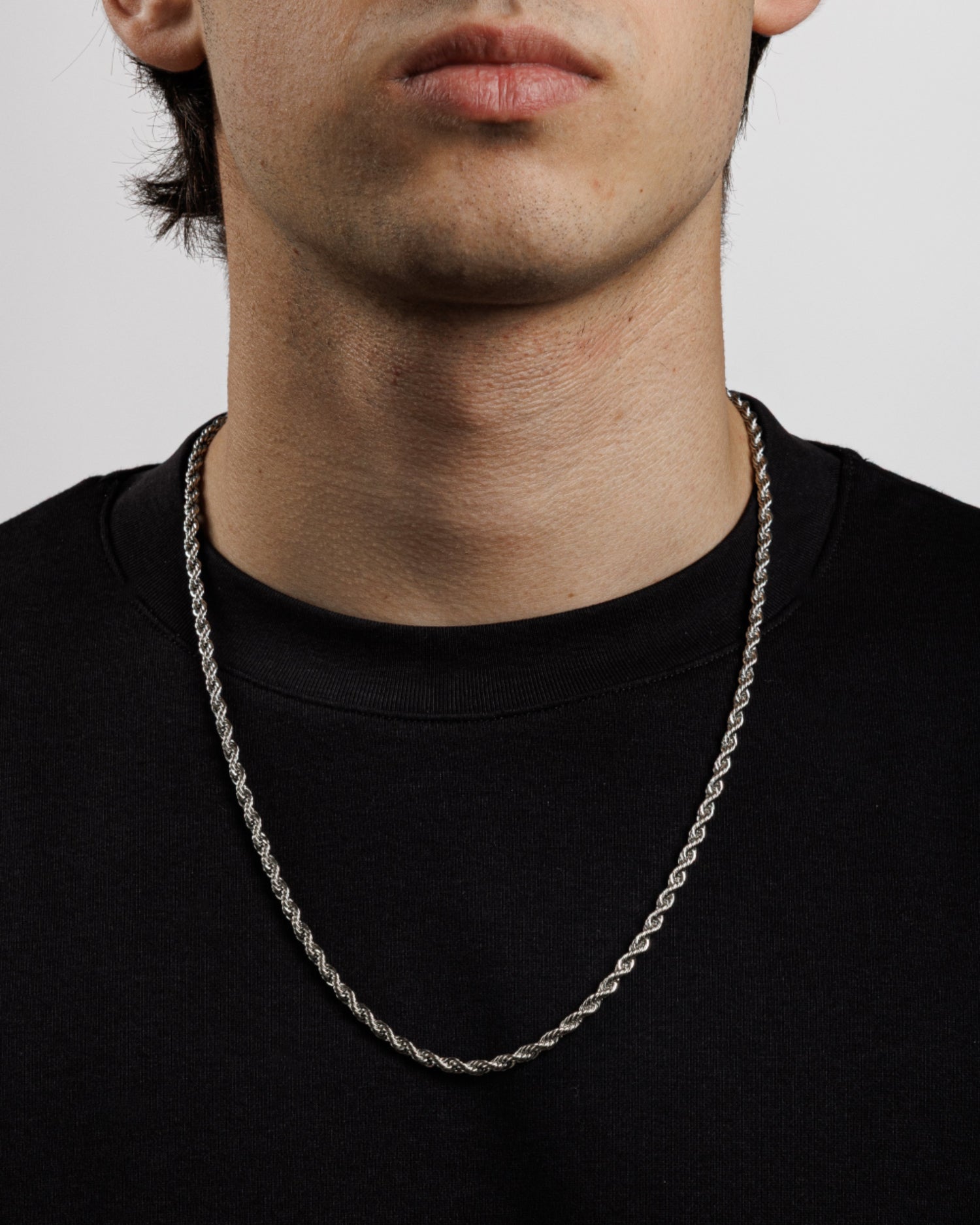 Gedreht wie ein feines Seil legt sich die 3 mm Rope Kette mit spürbarem Rhythmus um den Hals und bringt eine klare, dynamische Linie in den Look. Die dichte Twist-Struktur fängt das Licht sauber ein, wirkt markant ohne zu überladen und gibt Outfits vom Hoodie bis Hemd eine geordnete Kontur.